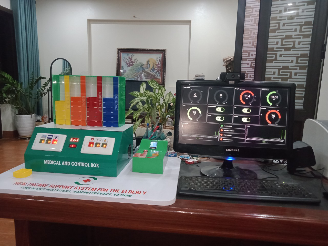 The system has two functions: measure such indicators as room temperature, humidity, light level etc. These indicators will be online, so that family members can see and control them remotely. The system also includes a medication box that triggers a signal at set times to remind people to take their medications. If they do not take them, the system sends notifications to family members so they can intervene.